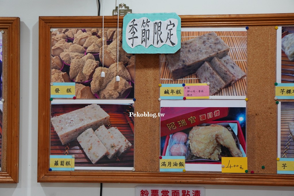 除了草仔粿、芋粿巧,「阿瑞官粿店」還有南瓜粿、芋粿、紅龜粿、紅龜粿、年糕、發糕、鹹年糕、肉粽與彌月油飯等多樣商品。