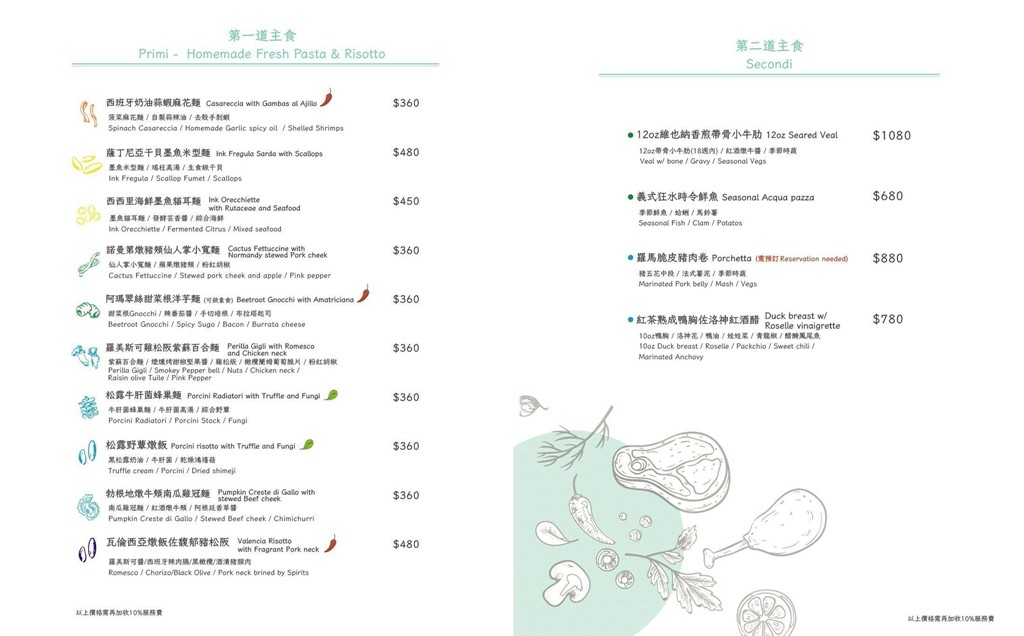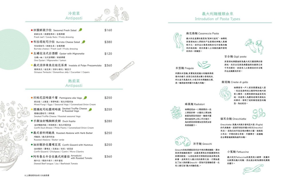 餐點有小食、前菜、自製手工新鮮義大利麵、義大利燉飯、排餐、甜點、咖啡飲料等,選擇豐富多元,另外也有提供酒精飲品,調酒、啤酒、氣泡酒、紅酒白酒都喝得到。禁止酒駕,飲酒過量,有害健康。