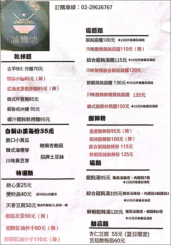 「誠贊號」主打川味麵食,乾拌麵、湯麵、酸辣粉、抄手、小菜、湯品、甜品,價格平實不貴。