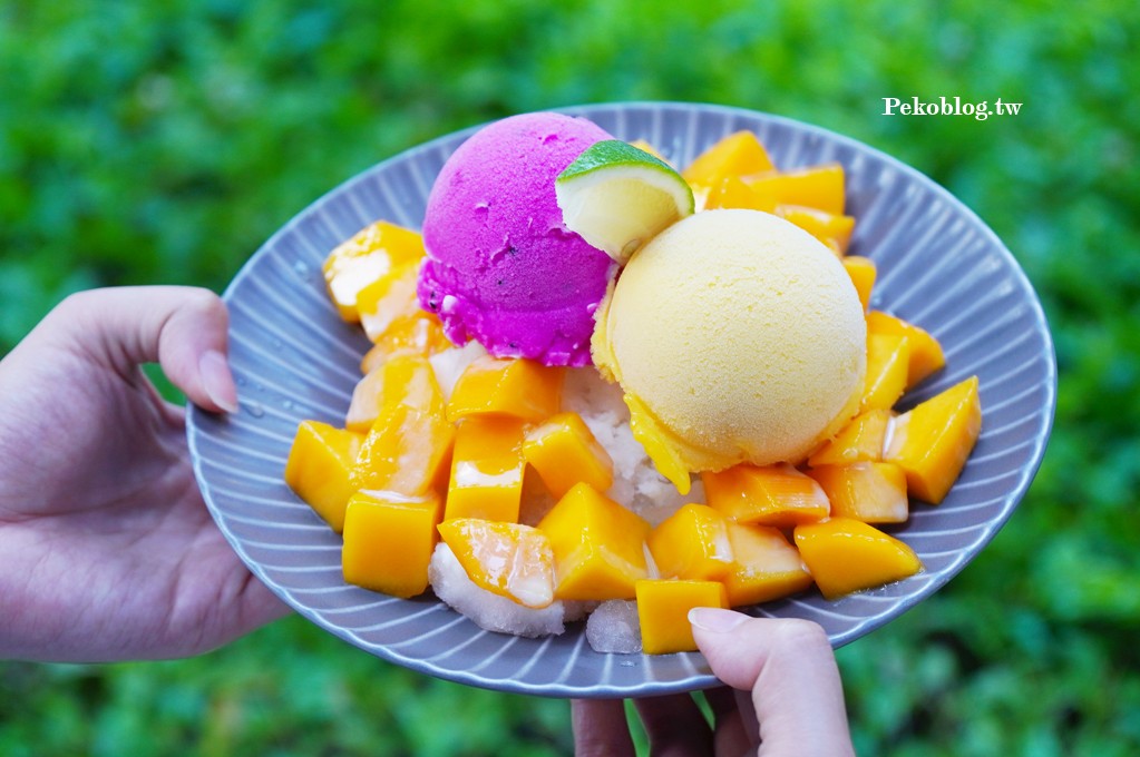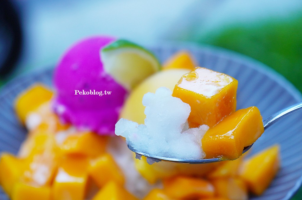 以清冰為基底,再鋪上新鮮芒果、淋上煉乳,接著放上兩大球水果綿綿冰(芒果+檸檬火龍果),色彩繽紛、口感層層堆疊,再擠點檸檬汁提升酸香,爽感直衝天靈蓋,視覺與味覺都漂亮得分,每一口都像在吃水果本人,綿密又不膩口,夏天沒來吃真的說不過去!