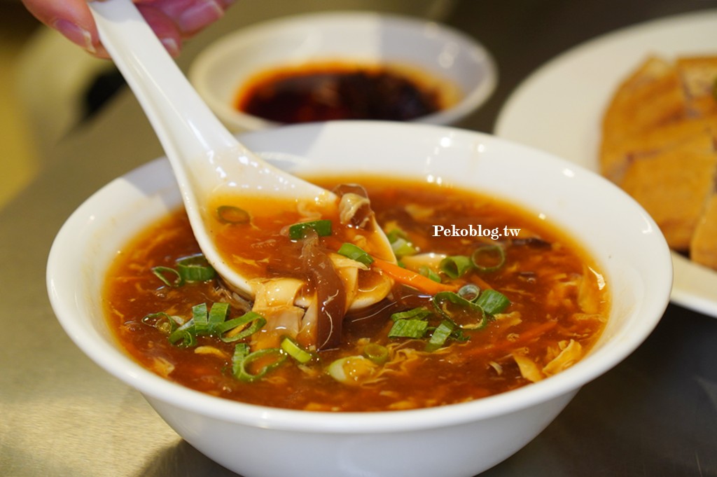 一上桌就能聞到撲鼻香氣,湯頭濃郁順口、酸度十足,不需要再額外加醋就很夠味,配料有豆腐絲、木耳、蛋花等,薄芡讓所有的食材味道都融合成一體,只可惜豆腐絲偏少,少了點口感;搭配剛煎好的鍋貼一起吃,解膩又提味,雖然鍋貼是主角,但這碗酸辣湯完全是默默加分的小幫手。