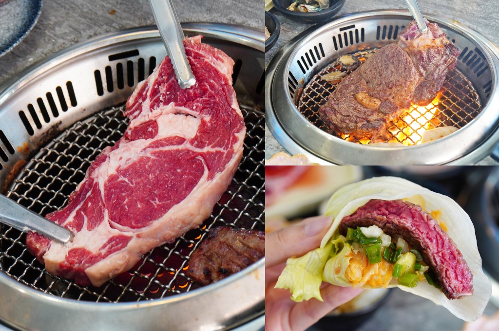 牛排一上烤網,油花立刻開始「滋~滋~」作響,中場店員還會「靜置」一下,讓肉汁回滲,烤到五分熟最完美,外層微焦,裡面多汁,柔嫩又有嚼勁,越吃越香、越嚼越甜,配點黃金泡菜、蔥鹽,再用生菜包起來,一口咬下爽度爆表,風味層次直接拉滿!
