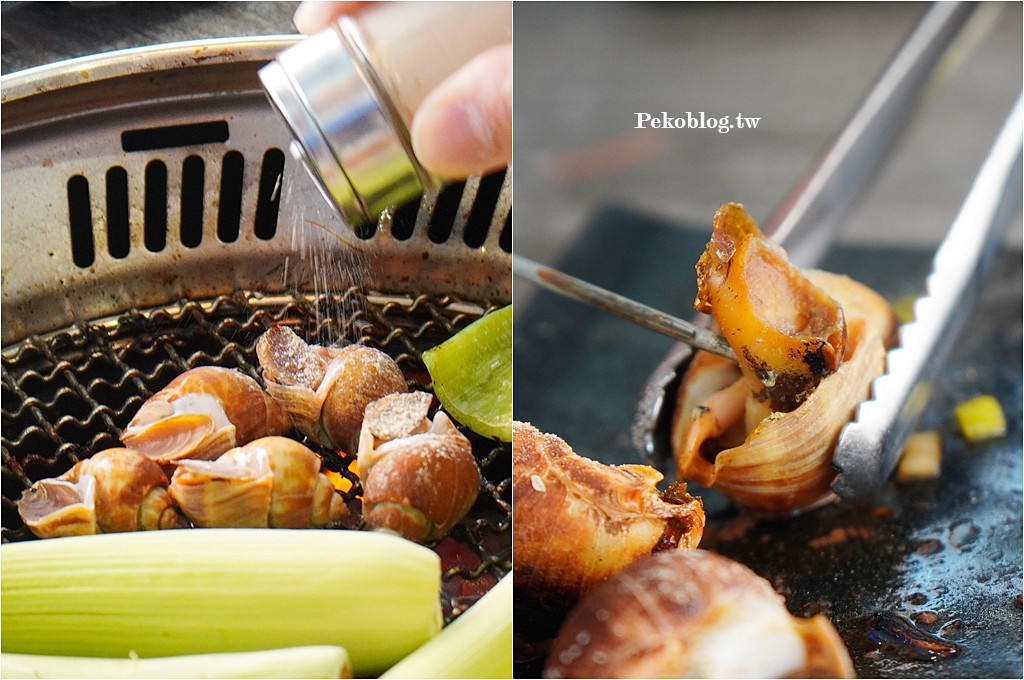 店員幫我們將鳳螺放上烤網後撒了椒鹽,然後小火慢烤,等看到開始冒泡就可以開吃了,自助區有提供鳳螺神器,可以輕易將螺肉拉出,口感Q彈帶脆,海味十足又不腥!