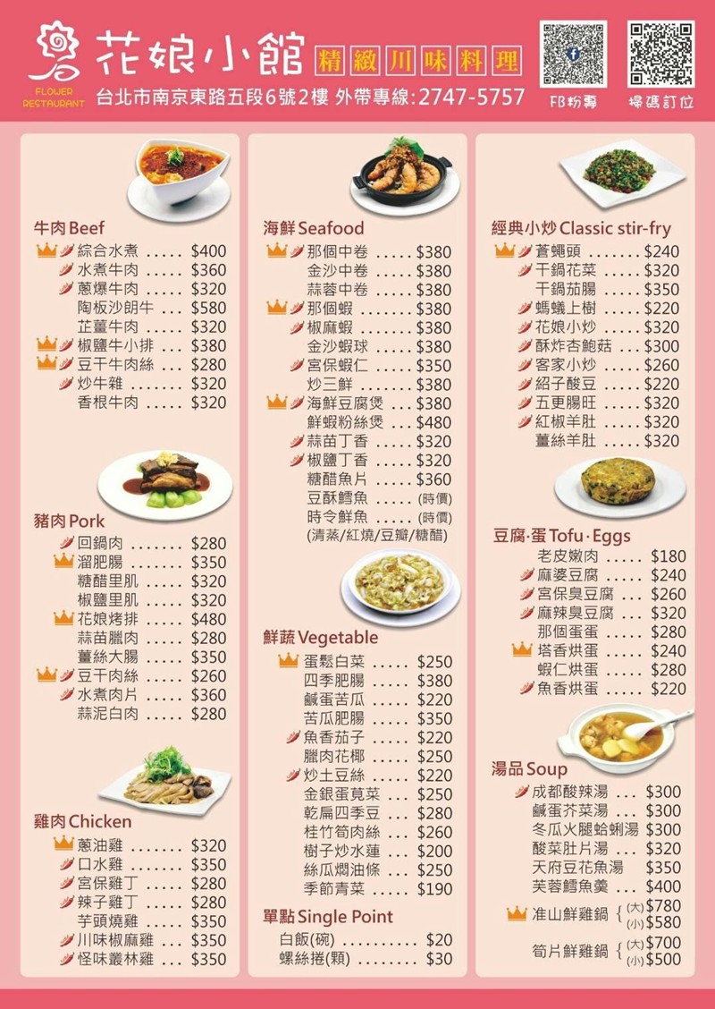 花娘小館菜單主打川菜與客家菜,肉類、海鮮、鮮蔬、經典小炒、豆腐&蛋、湯品通通有,價格大約落在300元上下,價格相當實惠,免服務費,還提供免費麥茶。(用餐限時90分鐘)
