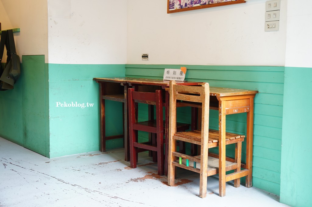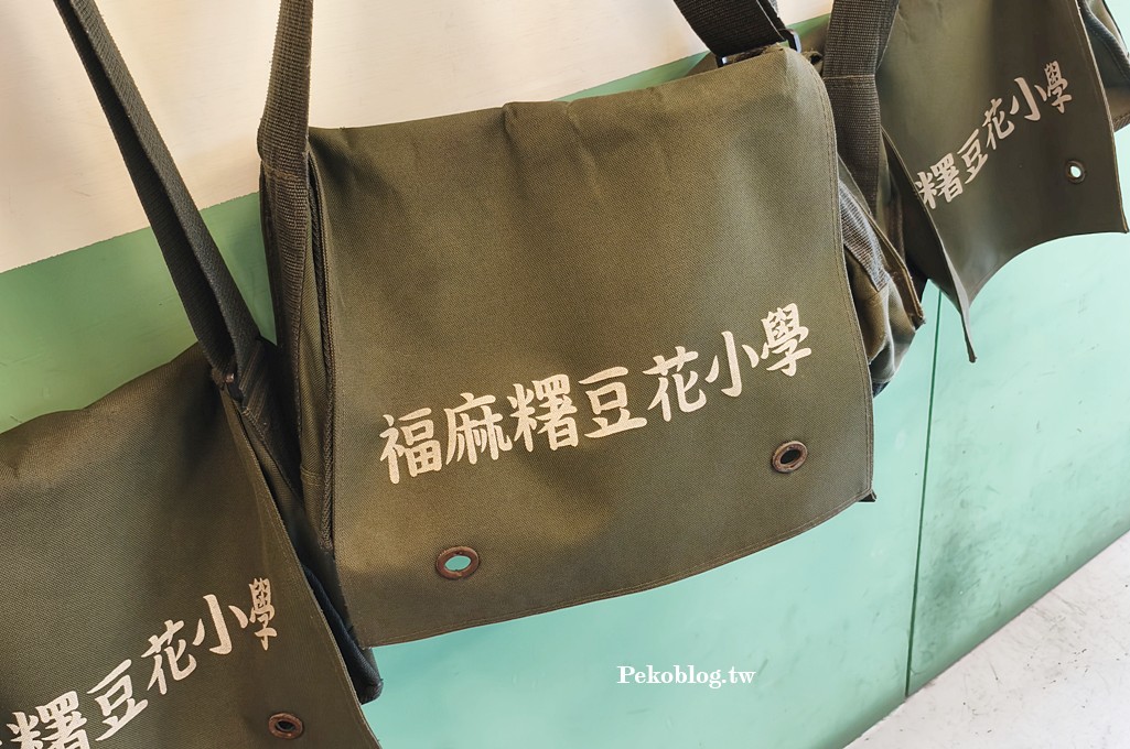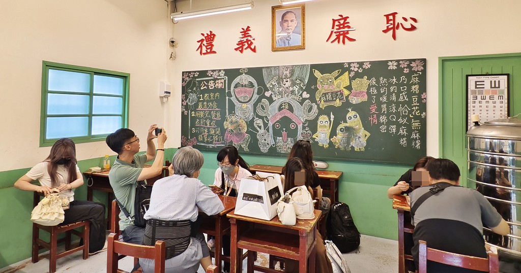「福麻糬豆花」的用餐空間完全復刻小學教室,木桌椅、大黑板,黑板上方還有大大的禮義廉恥跟國父照片,復古童趣風格讓人一秒回到小時候,感覺耳邊還會響起上課鐘聲:噹~噹~噹~,豆花小學上課啦!