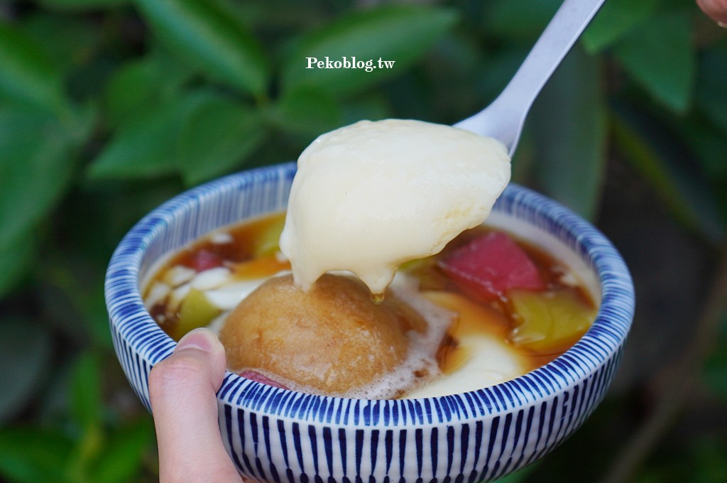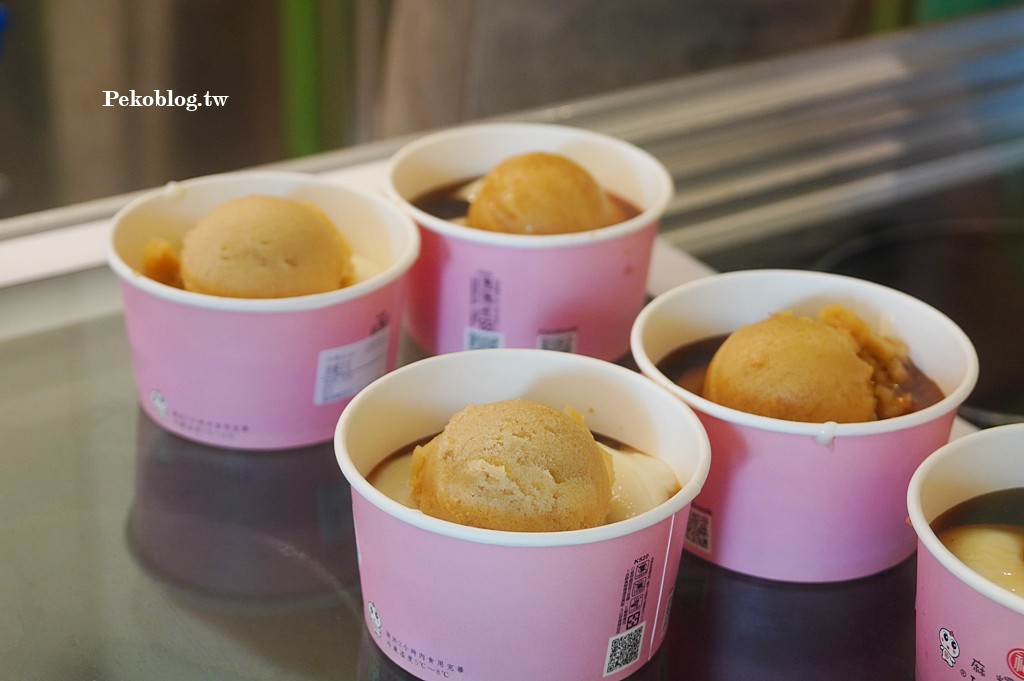 來到「福麻糬豆花」當然要點招牌麻糬豆花,一碗70元,可以選兩種配料,PEKO選了脆圓跟粉粿,麻糬豆花是糖水底,上面有一球黑糖冰沙球,脆圓跟粉粿吃起來口感雖Q,但沒有特別驚豔或特殊技藝點,就是一般的冰品配料。