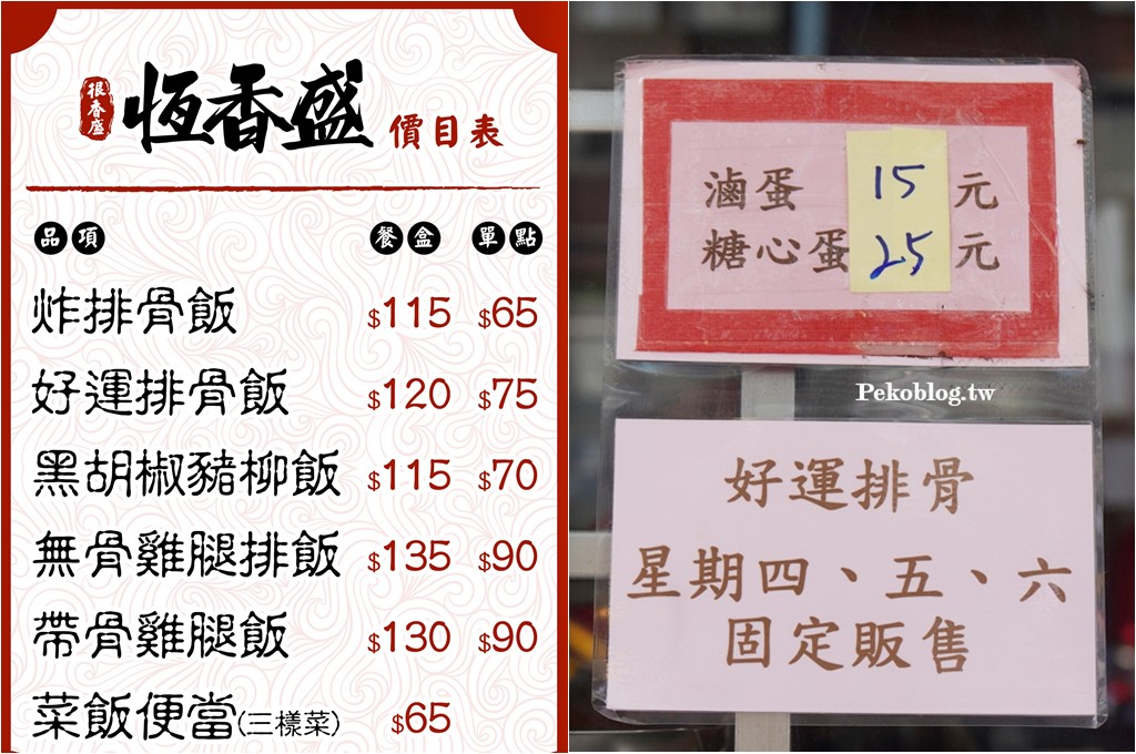 恆香盛菜單上只有賣五種便當,其中的好運排骨便當還是星期四五六限定,便當價格以板橋來說算正常。「恆香盛」配菜區的滷蛋(15元)、溏心蛋(25元)是需要加價的,然後好運排骨一星期只賣3天,想吃請星期四五六來買。