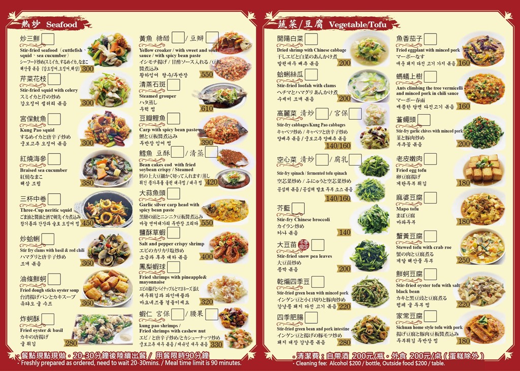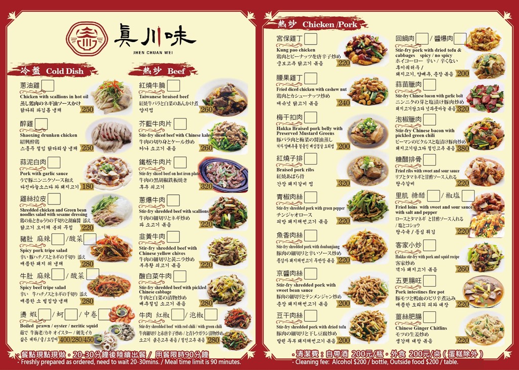「真川味」餐點選擇多元,冷盤、熱炒、肉類、蔬菜、豆腐、海鮮、火鍋等料理應有盡有,海鮮跟火鍋料理價格會比較高,其餘一盤菜約200元,建議最少4人共食,點個6道菜就足夠,平均下來一個人300元~400元就能搞定。(用餐限時90分鐘)