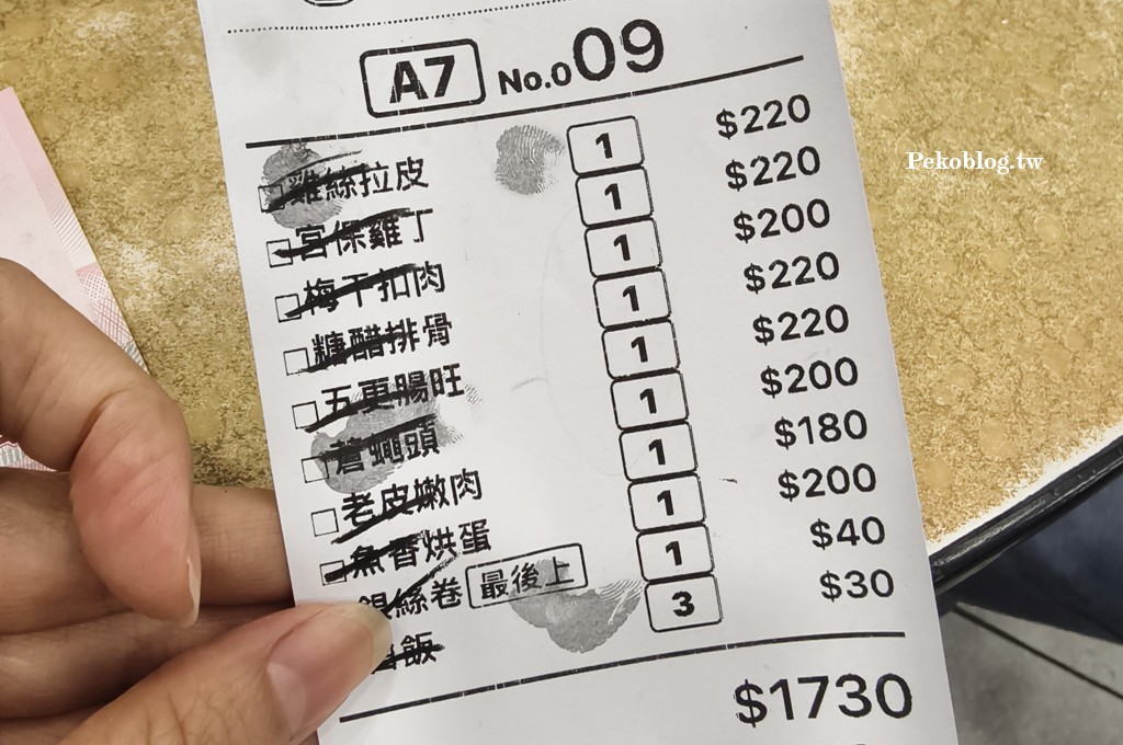我們這回5人用餐,一共點了9道菜,包含宮保雞丁、梅干扣肉、蒼蠅頭、老皮嫩肉、五更腸旺、糖醋排骨、魚香烘蛋、雞絲拉皮以及銀絲卷,平均一人350元有找。