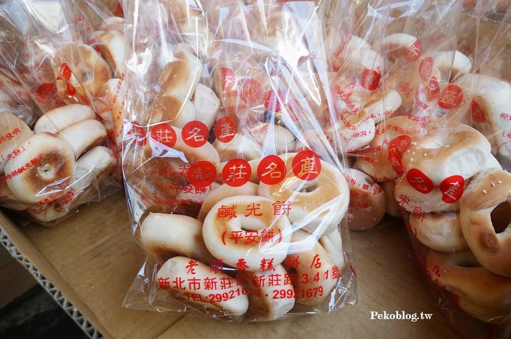 鹹光餅(也叫平安餅、台式貝果),源自明代將軍戚繼光的戰糧設計,中間有洞可穿繩,方便攜帶,後人為紀念戚繼光,將餅取名為「光餅」,又因其口感帶有鹹味,遂稱之「鹹光餅」,是新莊大拜拜不可或缺的供品之一。