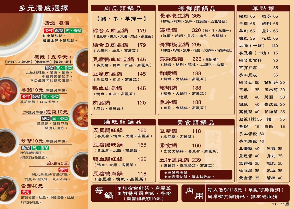 「梁季小火鍋」的湯底十分多元,除了清燉藥膳跟麻辣,還有番茄、泡菜、沙茶跟當歸當底,不過,除了清燉藥膳,其它都要加價;選好湯頭後就是選擇鍋物內容,最受歡迎的是綜合A肉品鍋(沒有火鍋料),每鍋均有金針菇、高麗菜,附餐可選白飯跟冬粉。