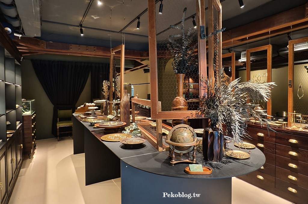 推開「慢溫密室」的大門,入眼的是造型獨特的乾燥花藝作品,以及復古地球儀,獨具風格的環境,讓PEKO眼睛為之一亮,深沉的橄欖綠、穩重的棕色以及內斂的鐵灰色構成了空間的主基調,木質的展示架和櫃檯散發著溫潤的質感,與金屬的線條和細節相互輝映,營造出一種沉靜而富有品味的氛圍,在一片純白韓系咖啡廳風潮中,這裡跳脫常規的配色反而更突顯質感與設計細節。