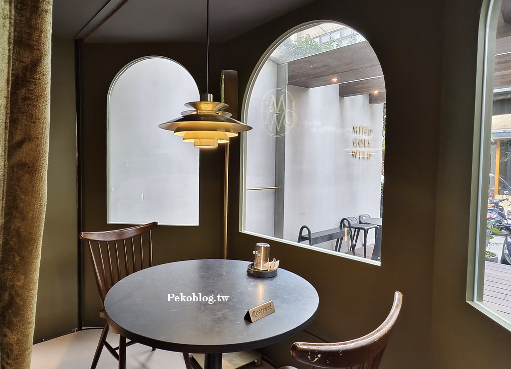 照片中的這個區域則是「慢溫咖啡」的用餐區,使用不同款式的木製椅子混搭使用,增添了空間的層次感和隨性感,靠牆的座位提供柔軟的靠墊提升了舒適度,營造出輕鬆愜意的氛圍,燈光的運用也恰到好處,軌道射燈提供了重點照明,照亮了桌面和牆面,營造出柔和而溫馨的光線,光線的明暗對比,也使得空間更具層次感,絕對是目前東區咖啡廳推薦名單中的潛力黑馬。