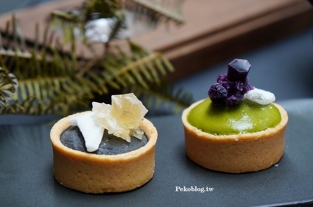 藍莓口味琥珀糖搭配抹茶塔、蘋果風味晶簇點綴芝麻塔,塔上還有Q 彈大福皮,就像是能吃的寶石塔,超夢幻!