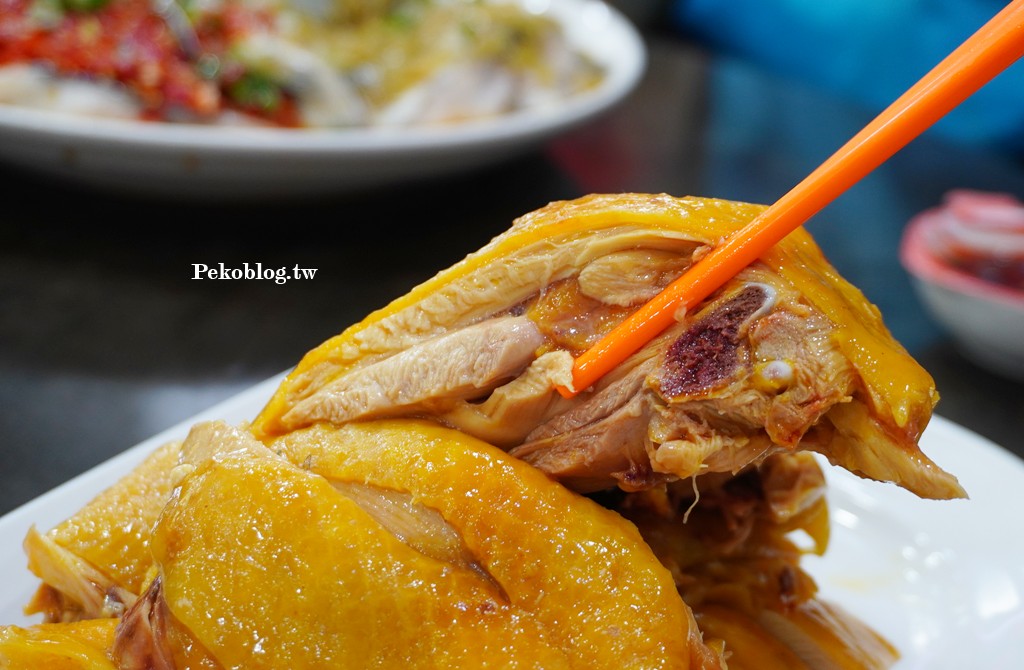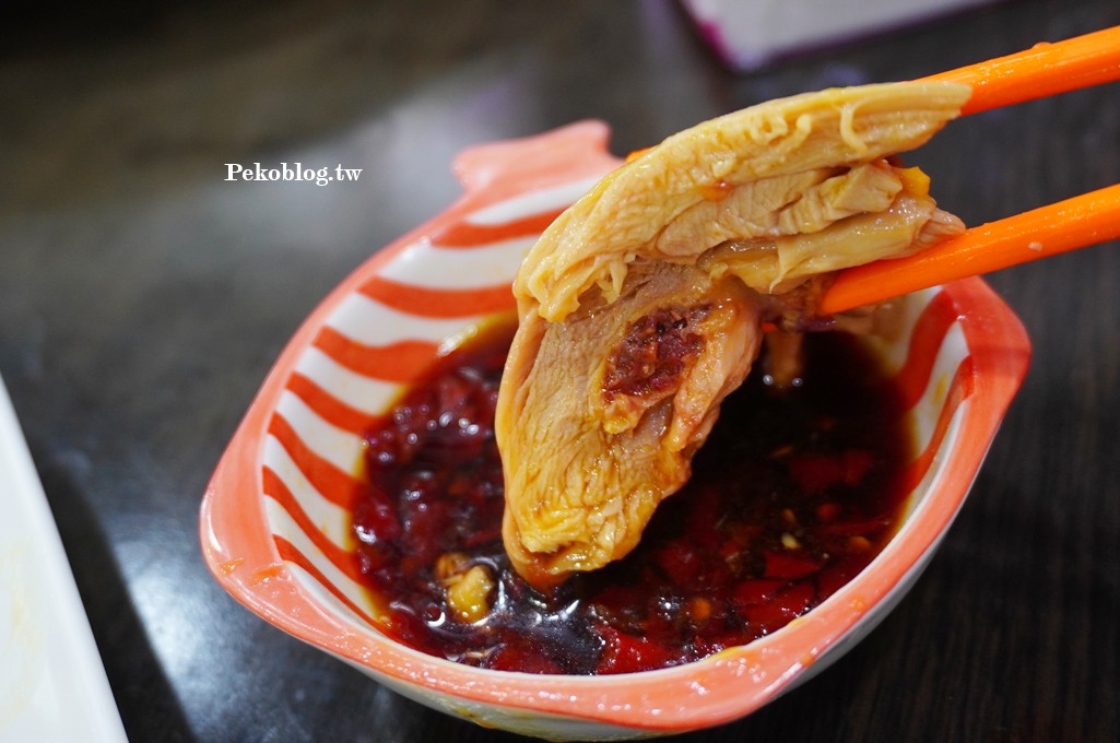 黃澄澄的雞皮看起來就超誘人,使用玉米雞製作,雞皮脆香、雞肉緊實又帶汁,皮滑肉嫩,完全不是一般油雞可比,沾點辣椒醬後更引出其甜味!