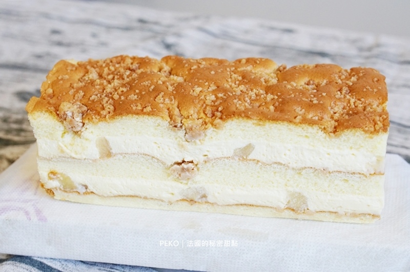 2019新品,乳酪x蘋果x牛奶的絕妙組合!!鮮奶蛋糕口感綿密細緻,法國No.1的 KIRI乳酪香濃微鹹,沙布烈餅乾香酥增添口感,獨家熬製蘋果餡微甜,整體風味微甜微鹹,讓PEKO小小驚豔了一下。