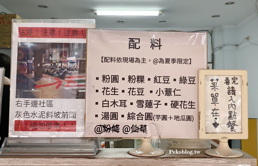 冰品配料包含粉圓、粉粿、紅豆、綠豆、花生、花豆、小薏仁、白木耳、雪蓮子、硬花生、湯圓、綜合圓(芋圓+地瓜圓)