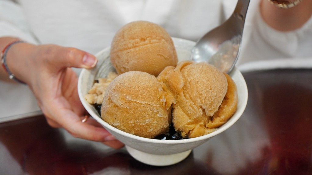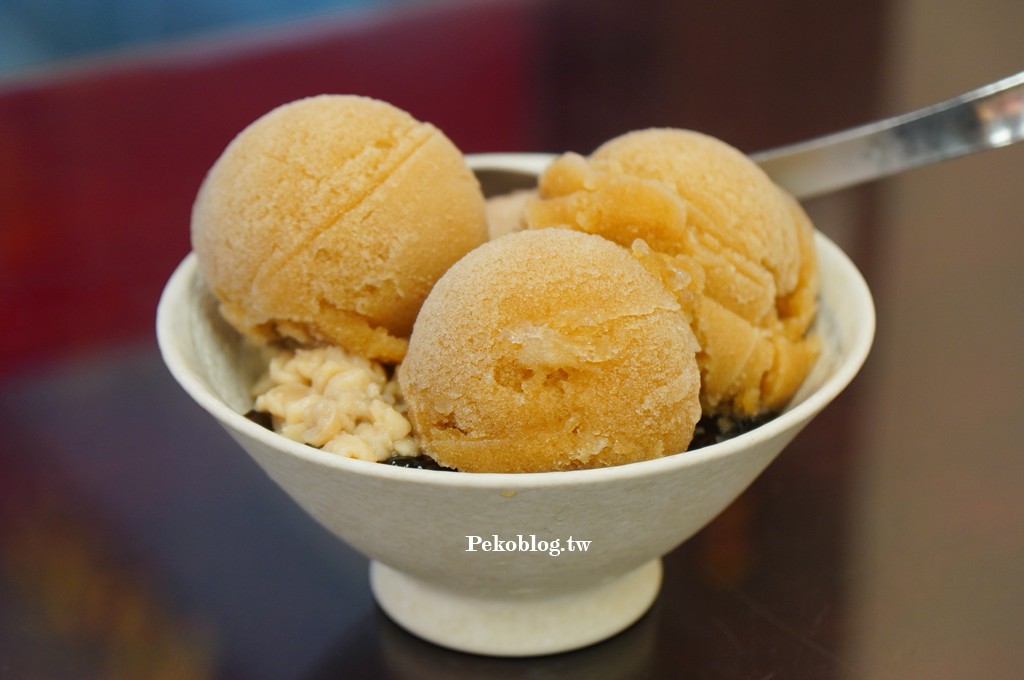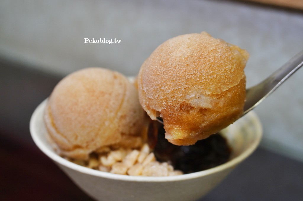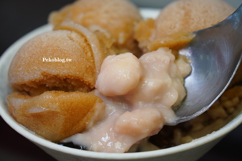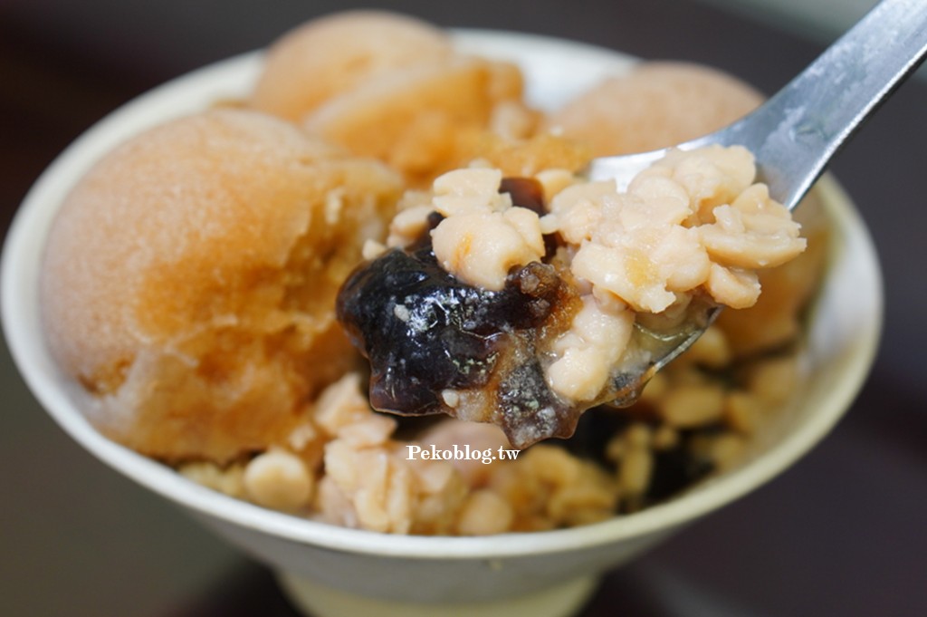 【劉家豆花】的綜合冰可任選三種配料,PEKO選了芋頭、花生跟嫩仙草,店員會先鋪一層黑糖綿綿冰在底部,然後添加配料,最後再挖上三球黑糖綿綿冰球。