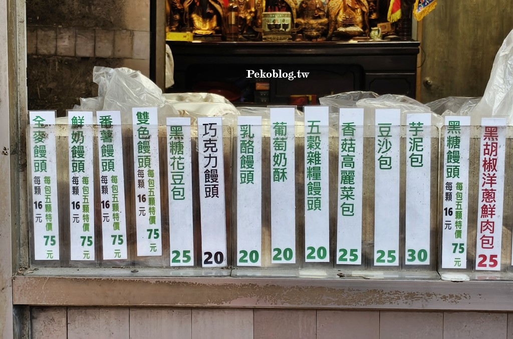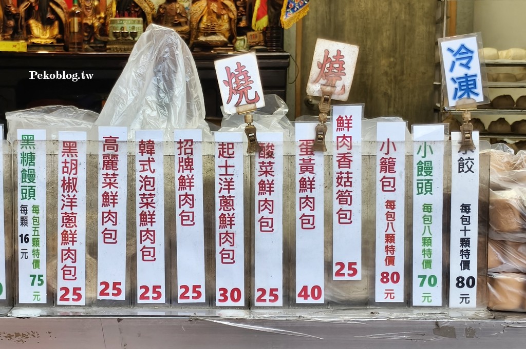 店裡的包子饅頭口味包含招牌鮮肉包、鮮肉香菇筍包、黑胡椒洋蔥鮮肉包(微辣)、酸菜鮮肉包(微辣)、蘿蔔絲鮮肉包、香菇高麗菜包(素)、黑糖花豆包(素)、芝麻包、芋泥包(奶素)、黃金起士鮮肉包、豆沙蛋黃包、芋泥蛋黃包、五穀雜糧饅頭(奶素)、葡萄奶酥饅頭(奶素)、乳酪饅頭(奶素)、蔥花捲饅頭、黑糖牛奶饅頭(奶素)、蕃薯饅頭(奶素)、小肉包、黑糖花豆(素)以及讓PEKO撲空多次的韓式泡菜鮮肉包。