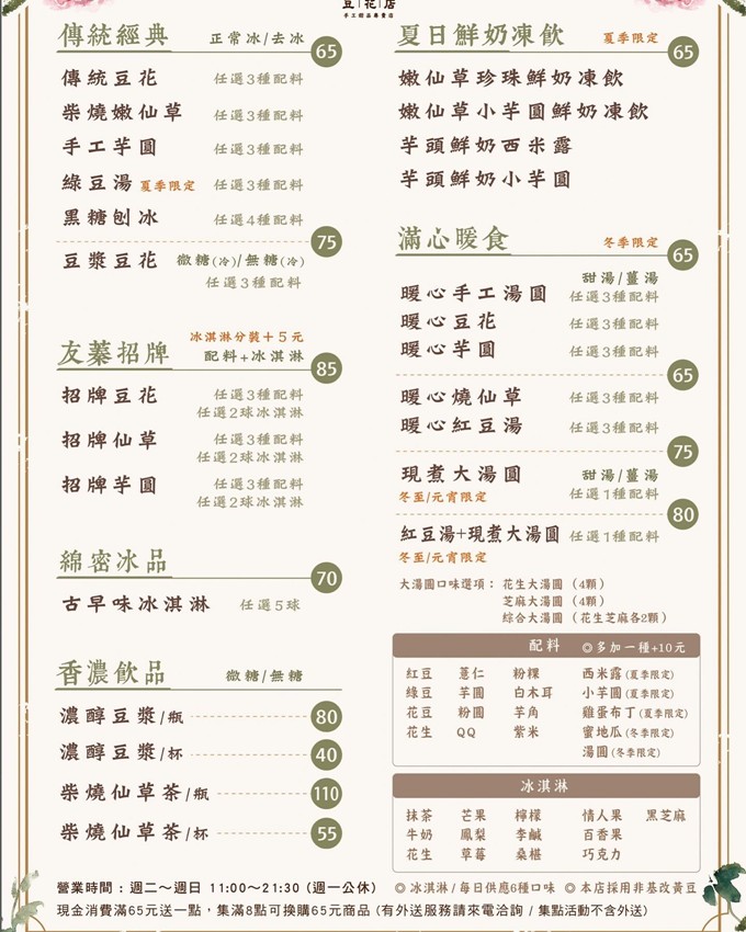 友蓁豆花提供的品項不算多,但每一樣都很有特色,包含傳統豆花、柴燒仙草、刨冰、飲品、冰淇淋與手工配料。消費滿65元可集1點,集滿8點就能免費兌換65元甜品,相當於買8送1,超划算!