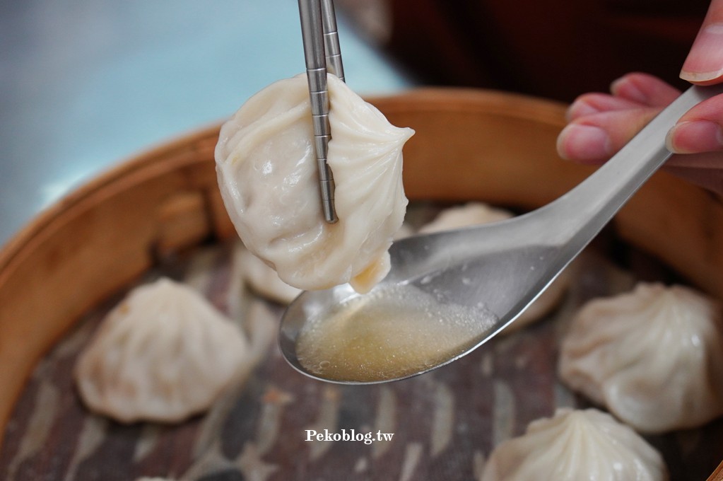 身為資深板橋人,PEKO覺得在板橋賣小籠包的店家比賣小籠湯包的店家多很多,「吳家蒸餃」的小籠湯包一籠有8顆,看起來雖有點乾扁,但是可以倒出湯汁的,而且還不少,肉餡也蠻鮮甜的,只是110元的價格不算便宜。