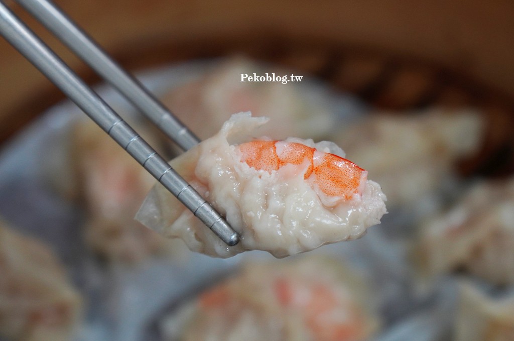 「吳家蒸餃」最大的特色就是"薄皮",雖說一夾起就可隱約看到裡頭的內餡,吃起來沒啥罪惡感,但這包法賣像真的蠻普的,鮮肉餡跟小籠湯包一樣,只不過多包了蝦仁,所以鮮度不如那種蝦泥肉餡,有點可惜,PEKO覺得點最便宜的高麗菜蒸餃就好。