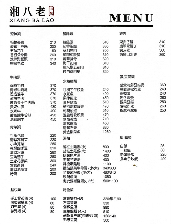 湘八老菜單以「彭園」經典菜色為基底,再搭配創意湘菜重新詮釋,餐點都有圖文介紹,直覺點菜就OK。湘八老必點菜色包含富貴雙方、生菜蝦鬆、彭家豆腐、左宗棠雞、剁椒臭豆腐以及刺椒魚頭等。