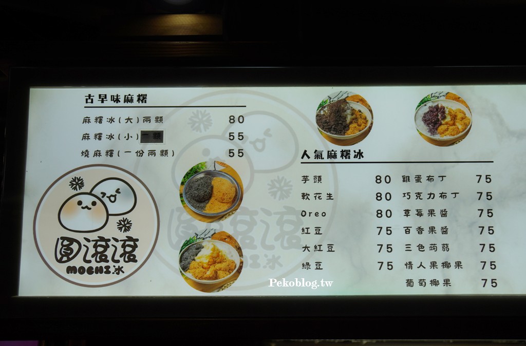 「圓滾滾麻糬冰」主打麻糬冰,價格以板橋來說稍微高了些,除了麻糬冰,也有燒麻糬跟手工豆花,冬天會多燒仙草、紅豆湯。