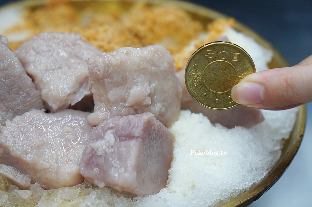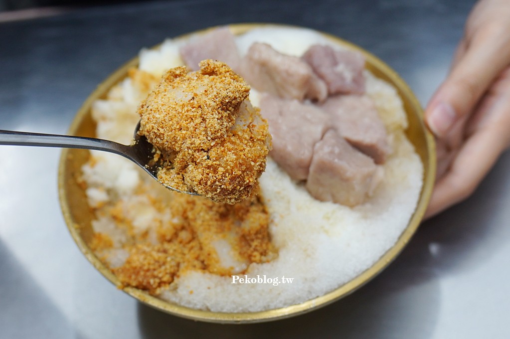 吃習慣了配料一堆的剉冰,看到「圓滾滾麻糬冰」的芋頭麻糬冰有種很樸實的感覺,燒麻糬、芋頭各霸一邊,底下是黑糖煉乳刨冰,簡單卻很有靈魂。麻糬外裹花生粉、剪成一口大小,軟Q不黏牙,芋頭大塊香甜(可惜沒到超綿口感)。冷熱交織,每口都超涮嘴!