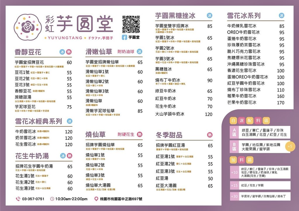 「芋圓堂」不只賣芋圓,還有豆花、雪花冰、花生牛奶湯、仙草、燒仙草、黑糖剉冰,配料可自選,也有配好的組合。